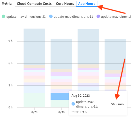 In the App Hours view, each bar shows the total number of application hours, and the different colors show the breakdown of core hours used by each application.
